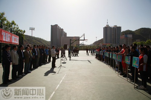 本网讯 5月12日下午,我校2011年“联通杯”教职工篮球赛开幕式在校篮球场举行,张威虎副校长出席开幕式并讲了话,中国联通延安分公司党群工作部经理任尚斌,我校工会副主席、附属医院工会主席沙文江,各基层分会主席,以及230多名运动员参加了开幕式。开幕式由校工会副主席徐宁主持。