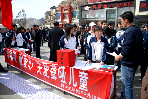 本次活动由生命科学学院团委发起、学生会负责筹划,通过在延安市内、校内等途径举行公益募捐,然后将募捐所得钱物,全部捐赠予延安市聋哑学校,以体现社会对聋哑儿童的关爱。本次募捐共筹集到衣物50包,书籍100多本,现金5384元。用筹集到的现金购买了一部25寸的彩电,100套学习用品,150本图书,还购买了篮球、足球等文体用品。在捐赠仪式上,学生们表演了精彩的节目,并与聋哑儿童进行了互动联欢。