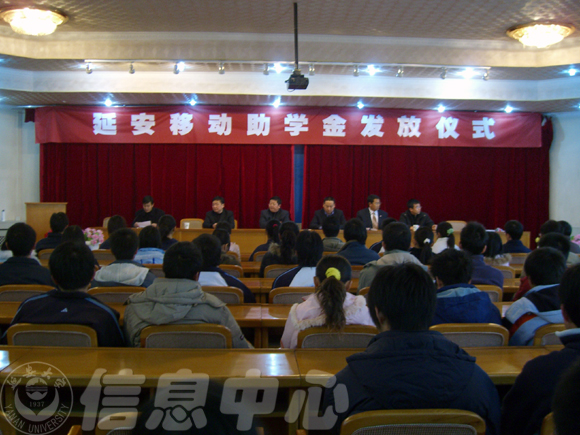 本网讯 12月26日下午,延安市移动公司助学金发放仪式在校多功能厅举行,延安市移动公司总经理王保,党群部刘延军经理,延安大学党委副书记高延龙,学生处处长韩卿元、副处长高峰及受资助的学生和各学院辅导员等参加了仪式。