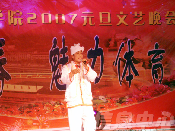 本网讯 2006年12月27日下午,校学生活动中心流光溢彩,人头攒动,随着振奋人心的开场曲《安塞腰鼓》,体育学院 “飞扬青春、魅力体院”2007年元旦文艺晚会在这里隆重举行。搏击操《重拳出击》、《活力篮球》、拉丁操《魅力四射》、歌舞《中国人》等节目反映了体育学子的风范,而舞蹈《不得不爱》、《白月光》以及独唱《当我想起你》、四重唱《明天会更好》等则映射了当代青年心声与追求,同学们自编自创的幽默剧《水浒外传》更将晚会推向了高潮。