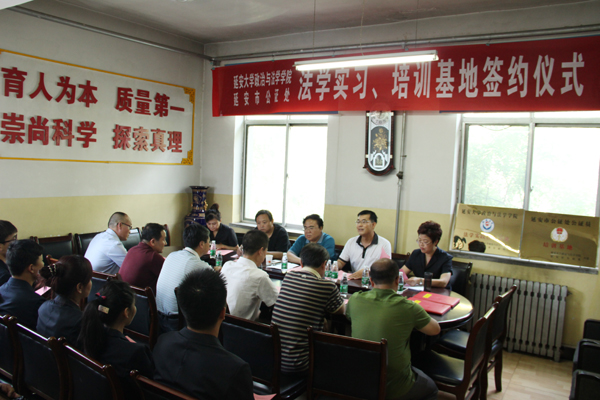 本网讯 7月23日下午,我校政法学院与延安市公证处共建法学教学实践基地、公证员培训基地签约仪式在政法学院会议室举行。延安市司法局党组书记、局长雷霄,延安市公证处主任周晓燕,政法学院领导班子成员等30余人参加了签约仪式。签约仪式由延安市司法局政治部主任郭玉平主持。