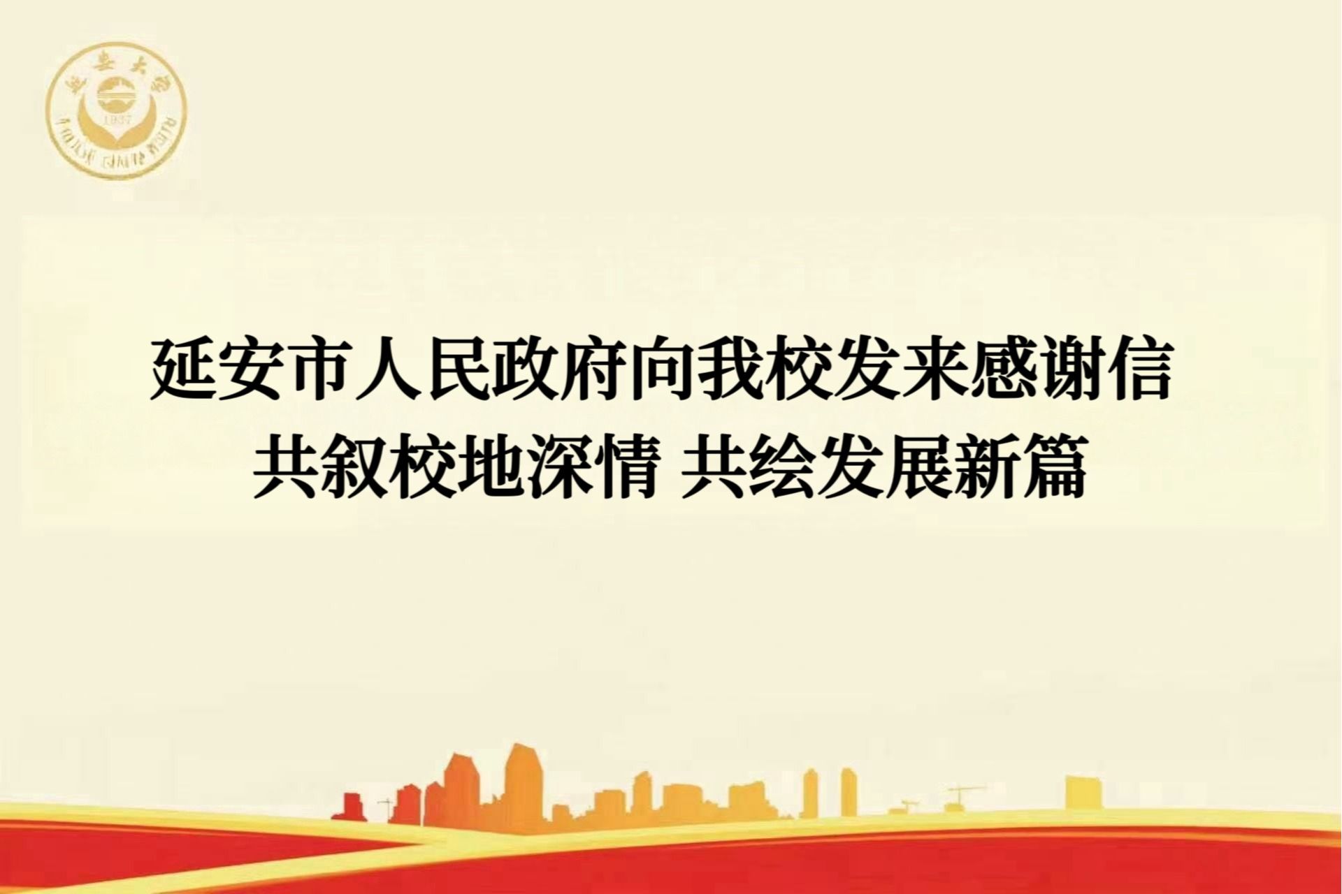 供稿:党委宣传部 核稿:王江华本网讯 2026年新春佳节来临之际,延安市人民政府向我校发来感谢信,向全校师生员工致以诚挚的新春祝福,并对学校长期以来为延安经济社会高质量发展作出的积极贡献表示衷心感谢。感谢信指出,延安大学作为中国共产党创办的第一所综合性大学,与延安血脉相连、休戚与共。过去一年,学校扎根延安、服务延安,双方在医疗卫生、地方公费师范生培养、能源化工、产业升级、科技成果转化等领域开展密切合作,...