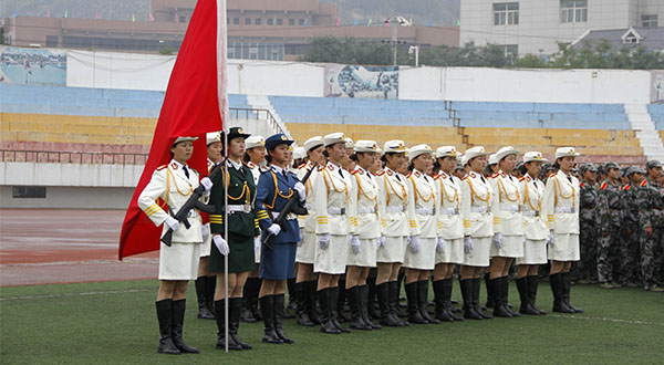 本网讯 “风雨磨砺坚强意志,汇报展示军训成果”。经过为期两周紧张而有序的军事训练,我校第42届学生军训汇报表演暨总结大会于今天上午在校田径场隆重举行。校领导薛义忠、张金锁、田伏虎、王顺、许静洪、马勇、范育琳,中国人民解放军边防学院大校王启田,延安军分区大校陈乾强,中国人民解放军边防学院上校张逆峙、中校雷鸣、少校姚翔,全体承训教官和2015级3605名学生参加了大会。大会由军训团临时党支部书记、我校学工部、武装部部长高峰主持。