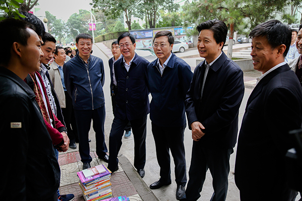 结束在学生宿舍的慰问后,校领导遇到了正在教务处教材科门口领教材的政法学院的2016级同学,对同学们来革命圣地延安求学表示了热烈的欢迎。薛义忠书记和张金锁校长认真地翻阅了同学们的课本,并询问了今年的教材选用及书本费用等方面的情况。薛义忠书记和张金锁校长语重心长地告诉同学们,延安大学是一所历史辉煌、贡献巨大的大学,有着光荣的传统和良好的校风、学风,先后培养了30多位党和国家领导人,300多位省部级领导人,以及文艺、教育等各条战线上的大批人才,希望大家从进入大学的第一天起,就牢固树立起自己的人生目标和奋斗目标,积极参与校内的学生自主管理,在奋斗中不断提升自己,实现人生的大跨越。