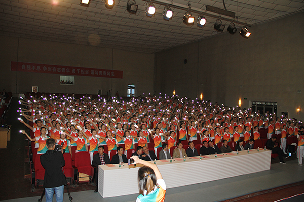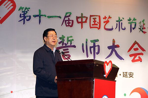本网讯 10月9日下午,伴随着整齐、嘹亮的口号,第十一届中国艺术节延安青年志愿者誓师大会在我校大礼堂隆重举行。共青团陕西省委书记段小龙,我校校长张金锁,延安市委常委、宣传部部长冯振东,团省委党组成员、省少先队总辅导员赵大胜,我校党委副书记田伏虎,团省委志工部调研员胡晓彤,延安市文化局副局长孙文芳,延安市旅游局副局长李伦,延安团市委副书记高晓斌,延安团市委党组成员、市青联副主席米泽宇,我校党委办公室、校长办公室主任刘述进,团委书记李扬,各学院分团委书记,以及来自我校的500名青年志愿者参加了大会。大会由田伏虎副书记主持。