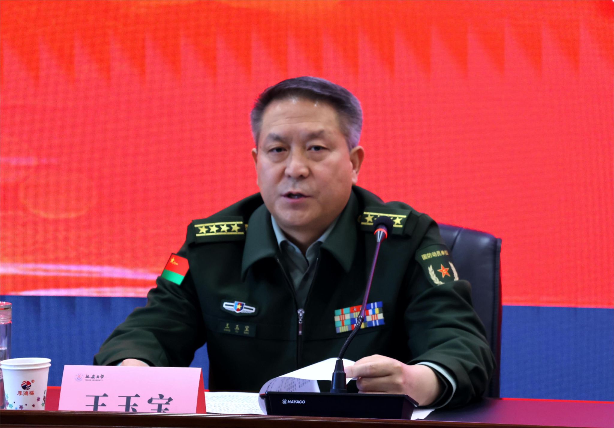 王玉宝在讲话中表示,优质兵员储备基地建设工作,是中央军委国防动员部、教育部、人社部、共青团中央联合部署,省征兵办、省教育厅、省人社厅研究批准的专项任务,是推进人才强军、科技强军,实现精准高效征集的务实举措,是依托优质教育资源为部队输送高素质兵员的有效途径,是涵养军地通用人才的可靠平台,对提升国防建设人才储备,拓宽院校毕业生就业渠道,都将发挥积极作用,他希望延安大学切实把兵员储备基地建好、建出成效。一是要提高政治站位;二是要确保规范运行;三是要坚持创新驱动。要切实发挥好兵员储备基地优势作用,特别是要紧盯毕业生这个工作重点,鼓励广大毕业生踊跃参军,报效祖国,保卫人民,为革命圣地争光,为革命老区添彩,为延安兵员征集贡献力量,为强军事业奉献青春年华!