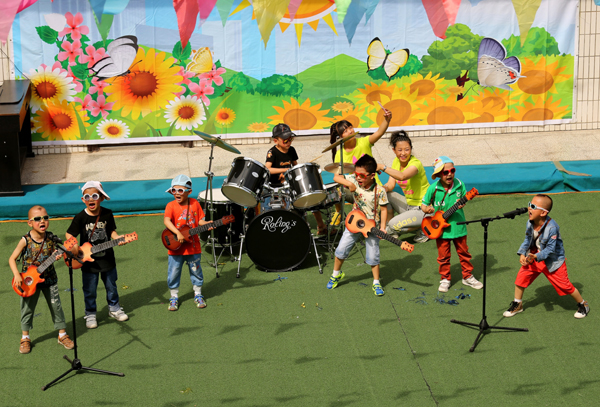 大一班的大合唱《种太阳》、《每当我走过老师的窗前》拉开了活动的帷幕。孩子们动情的表演,展现了对老师的浓厚情谊和天真烂漫;小班的舞蹈《数鸭子》童趣四溢,逗乐了所有观众,迎来了热烈的掌声;中班小朋友的歌舞《你是太阳,我是星星》孩子们的爸爸妈妈们也参与其中,表现出了父子和母女之间的浓浓亲情,感动了所有观众迎来阵阵掌声;大班的舞蹈《小苹果》《蜗牛与黄鹂鸟》等。孩子们穿着“潮流装”,戴着小眼镜,抱着小吉他,特个性,还有架子鼓伴奏的小朋友,个个威风凛凛,把大家震住了。
