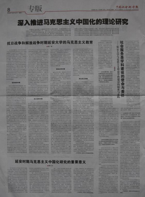 10月12日,《中国社会科学报》第8版整版发表了我校韩琳的文章《社会服务是学科建设的使命与责任——延安大学马克思主义理论学科建设的探索与实践》、高九江的文章《延安时期马克思主义中国化研究的重要意义》、袁广斌的文章《抗日战争和解放战争时期延安大学的马克思主义教育》。