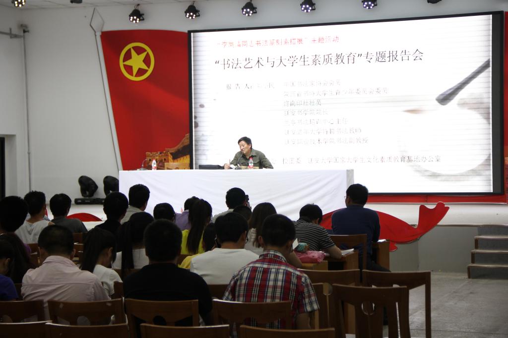 本网讯  69日上午,应我校科研处、校团委、延安大学国家大学生文化素质教育基地办公室邀请,中国书法家协会会员、延安市书法家协会副主席、延安书学院院长刘小民一行来我校举办了“书法艺术与大学生素质教育”主题活动,陕西省书法家协会会员、延安书学院何树德、张三全、吴欢显、程华等10余名书法家应邀参加。