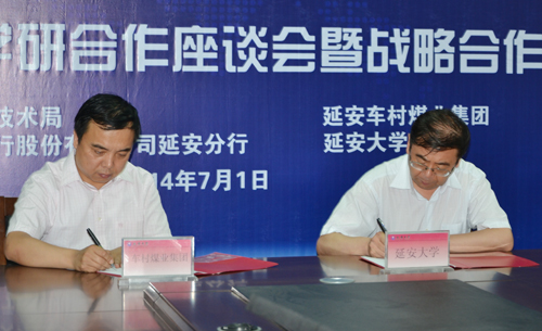 刘矿平董事长介绍了车村煤业集团的情况,提出了与我校合作的方向与思路,并希望通过政校银企的共同努力,开展系列校企合作项目,使其成为延安市产学研合作的典范。拓雪峰行长介绍了与车村煤业及我校合作的历史,提出将及时跟进产学研的进程,为延安市校企合作、科技创新提供资金支持。最后,马勇副校长和刘矿平董事长代表双方签订了延安大学与延安车村煤业集团产学研战略合作协议。