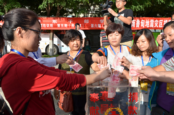 灾害无情,人间有爱。正在我校泽东干部学院接受革命传统及延安精神教育的山东省淄博市张店区2014年镇办基层党员干部培训班第5期(房镇镇)、第6期(科苑街道)的119名学员,听到这一消息后,深感悲痛,为了表达对灾区群众的哀悼和慰问之情,集体发出为鲁甸灾区捐款的倡议。