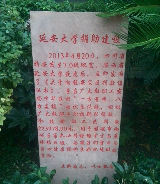 为了用好我校捐助的这笔经费,校工会积极与雅安市联系,决定将这笔捐款用于雅安市雨城区第六小学操场重建与篮球场改造。现完成了建设工作,本学期投入使用,该校领导专门打电话通报了建设和使用情况,对我校全体教职工为灾区孩子们学习与身心健康创造良好环境所做的贡献表示感谢。雅安市教育局网站以题为“延安大学心系雨城六小”进行了报道,其中写到“为支持雅安的灾后重建,延安大学的全体师生为我校伸出了援助之手,捐款223978.90元用于我校操场维修,经过假期50天的修建,8月20日全面竣工。目前操场已焕然一新,1300平方米的防滑广场砖和1100平方米的悬浮式塑胶球场替换了破旧的操场,师生们在新学期里可以安全放心地在新操场活动。延安大学的这一善举,以实际行动体现了心系灾区、心系雅安教育、情系雅安孩子的高尚情怀。我校全体师生将永远铭记、感恩延安大学的大爱,以实际行动和优异的成绩回馈社会”。