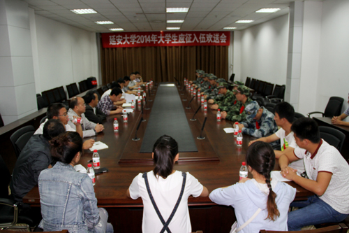本网讯9月10日上午,我校在图书馆二楼会议室举行了2014年大学生应征入伍欢送会。党委副书记田伏虎、学工部(武装部)、教务处等部门负责人,体育学院、能源学院、建筑学院、物电学院、生科院、鲁艺学院主管学生工作负责同志、我校应征入伍的大学生及部分学生代表参加了欢送会。欢送会由武装部副部长王彦杰主持。