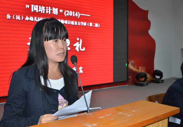 随后,张社争院长介绍了延安大学教师培训中心的情况,并对这次培训工作进行了具体安排。张社争院长希望各位学员一定要珍惜这次难得的学习提高的机会,努力克服来自工作、生活、家庭等诸多方面的困难,放下心来,全身心投入到学习当中来,学有所思,学有所悟,学有所得,学有所成;尊重老师,虚心请教、不耻下问;互相关心,真诚交往,珍惜友谊。黄龙县双龙镇中心幼儿园副园长郑敏作为培训班学员代表发了言。