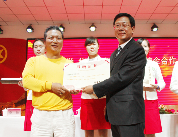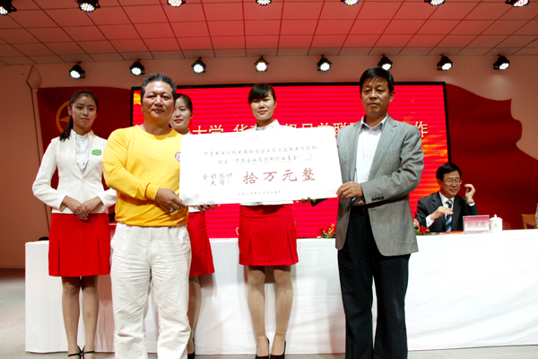 随后,田伏虎副书记与洪涛阳主席分别代表双方在校企合作协议上签了字。华商班级兄弟联盟向我校捐赠了10万元的大学生创新创业基金,高峰处长代表我校接受了捐赠;田伏虎副书记代表我校向华商班级兄弟联盟颁发了捐赠证书并赠送了纪念品。
