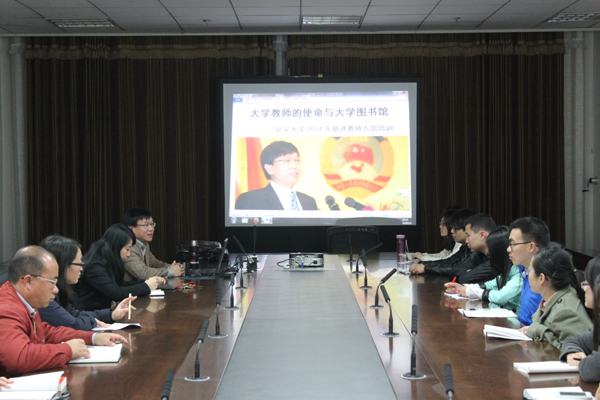 19日晚,人事处组织青年教师接受入馆教育,图书馆馆长徐长玉作了《大学教师的使命与大学图书馆》的专题报告,通过培训,激活和提升了青年教师的图书意识,熟悉了我校图书馆的各种资源和服务,对自觉、主动利用图书资源促进教学、科研的深入研究有了新的思考。