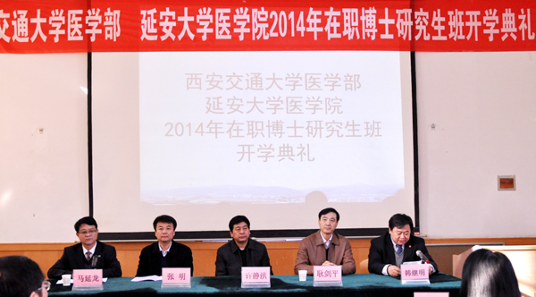 医学院院长韩继明在开学典礼暨基地揭牌仪式上致了辞。他在致辞中中介绍了延安大学医学教育办学历史和基本情况,并从师资培养、科研工作、学科建设等方面阐述了举办在职博士研究生班的目的和意义,勉励所有学员珍惜机会,锐意进取,早日学成归来,为建设高水平大学贡献力量。西安交通大学医学部人才培养处处长张明与我校韩继明院长签署了合作备忘录。
