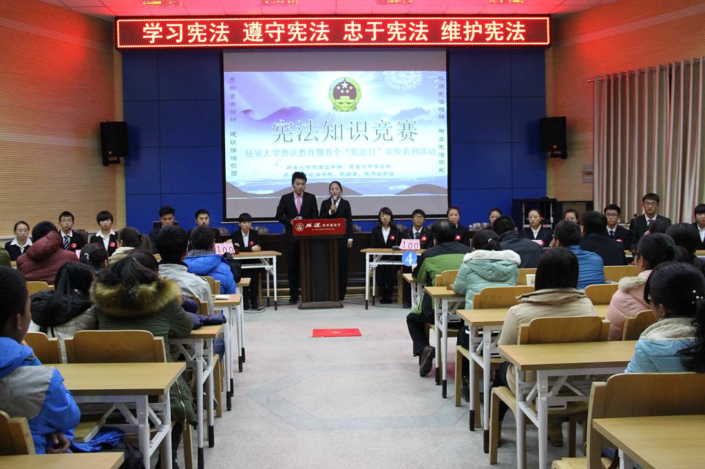 本网讯 12月4日晚,我校党委宣传部、校保卫处、政法学院及政法学院团委、学生分会联合举办纪念首个“国家宪法日”宪法知识竞赛。竞赛设现场竞答和同步笔试两个赛场,分别在路遥学术报告厅和政法学院会议室进行。我校学工部、保卫处、政法学院有关负责同志出席了活动。政法学院各专业学生组成的7支代表队参加竞赛,100余名学生代表观看了竞赛。政法学院许渊琦和刘雒宇两位同学主持知识竞赛。