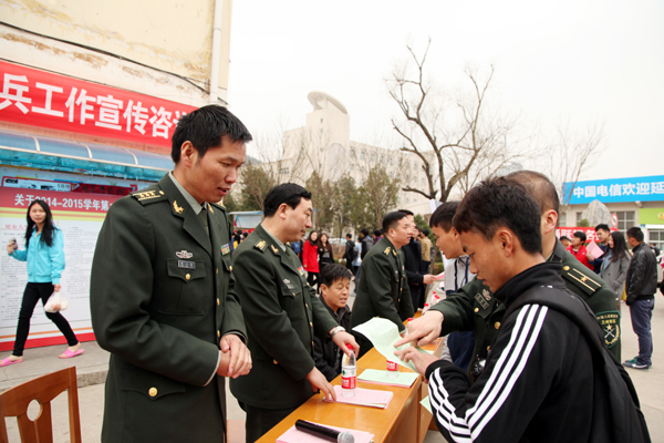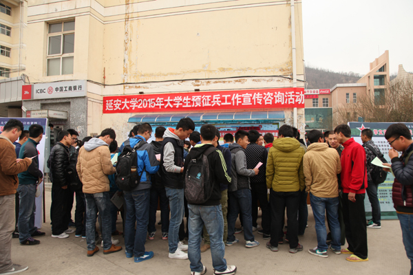 本网讯 3月25日上午10时,我校学工部(武装部)在雅苑校区开展2015年大学生预征兵宣传咨询活动,延安军分区参谋长陈凤岭、宝塔区武装部部长陈占波、政委马林兹、副部长王军舰,我校学工部(武装部)部长高峰、副部长王彦杰、处级调研员王延海等参加了这次宣传活动。