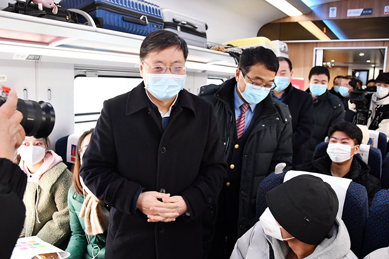首趟专列开行前,延安大学校领导与工作人员及学生志愿者一同为同学们送行,并叮嘱大家务必戴好口罩,做好个人防护,过一个平安、开心的寒假。