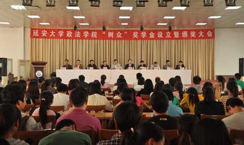 本网讯 4月17日下午,政法学院“树众”奖学金设立暨颁奖大会在校学生活动中心举行,我校教务处处长武忠远,陕西树众律师事务所主任崔树森、副主任申边江,我校学工部副部长马小惠,以及我校政法学院副院长张文生、副院长邹腊敏、刘向林等,与近百名师生参加了大会。会议由政法学院党委书记葛彬主持。