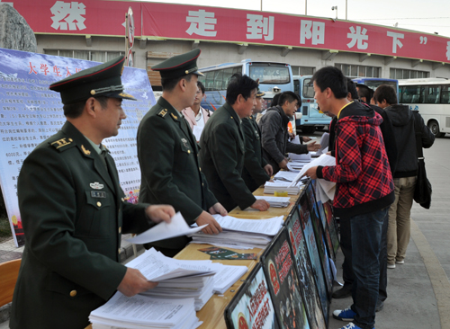 本网讯 为了响应国家号召,集中开展2012年冬季征兵入伍宣传动员工作,形成我校在校大学生生积极报名应征入伍的良好校园氛围,根据学校2012年征兵文件安排,10月30日,我校就业指导中心、武装部和延安市宝塔区武装部共同举办了2012年冬季征兵入伍现场咨询会,延安市宝塔区武装部副部长马永刚,我校就业指导中心副主任崔林立、武装部李志福等,在雅苑学生公寓前为在校大学生就入伍的相关政策和报名程序、要求等进行了解答,并发放了近4000份宣传材料。