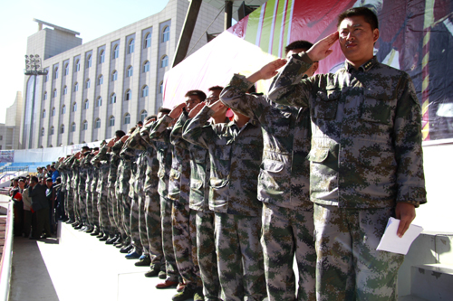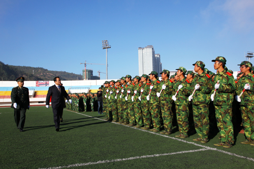 崔智林校长在张逆峙上校和王延海政委陪同下检阅参训学生方阵。 郭伟/摄