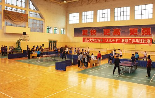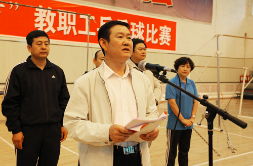 本网讯 今天上午,由校工会委员会主办,体育学院和校教职工乒乓球协会协办的我校2012年“庆祝教师节”教职工乒乓球赛开幕式,在校体育馆举行,副校长许静洪,校教职工乒乓球协会主席苗乃周,协会副主席张高旗、韩继明、靳丽萍,秘书长韩卿元,体育学院院长郑兵,校工会常务副主席白泽生和来自全校16个基层工会的120余名运动员参加了开幕式。开幕式由校工会副主席徐宁主持。