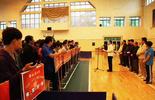 许静洪副校长在开幕式上致了辞。他在致辞中希望通过这次比赛,能够促进学校教职工文体活动的开展与交流,进一步促进各部门之间的友谊和联系,增强教职工的集体主义观念和团队精神,不断提高我校教职工乒乓球比赛的竞技水平。随后,机关一分会李晓峰和体育学院张键分别代表运动员和裁判员宣了誓。