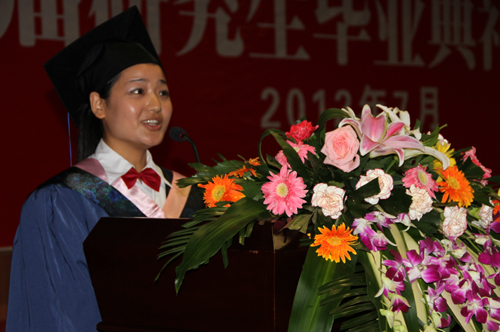 随后,工作人员依次宣读了学校《关于表彰优秀硕士研究生指导教师的决定》、《关于表彰优秀硕士学位论文获得者及其指导教师的决定》和《关于表彰2009级优秀毕业研究生的决定》,全体校领导分别为优秀硕士研究生指导教师、优秀硕士学位论文获得者及其指导教师和优秀毕业研究生颁发了荣誉证书。马克思主义基本原理专业学生拓宏伟和政治经济学专业学生谢岗代表毕业生向母校赠送了纪念品,崔智林校长代表学校接受了赠品。硕士研究生导师、外国语学院院长梁润生和文学院文艺学专业学生陶蕾分别作为导师代表和毕业生代表发了言。