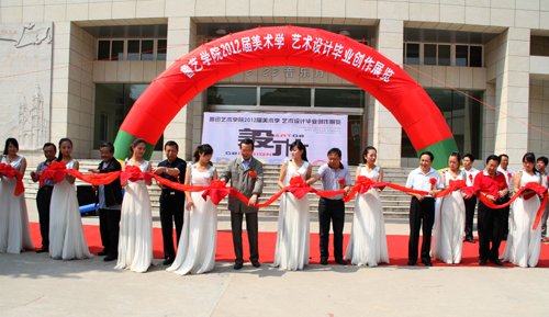 本网讯今天上午,我校鲁艺学院美术学和艺术设计专业2012届学生毕业作品展在星海楼开展。我校副校长胡俊生,原延安市人大常委会主任郝飚,原延安市政协主席樊高林,延安市人大常委会副主任张宏,陕西省美协副主席、延安市文联主席、延安书法家协会主席张永革,延安日报社副社长、延安市政协文艺体委员会主任白世锦,我校教务处副处长雷伟,鲁艺学院院长刘常喜、书记周庆丰、副院长冯颜明、郝磊,以及美术系全体师生参加了剪彩仪式。