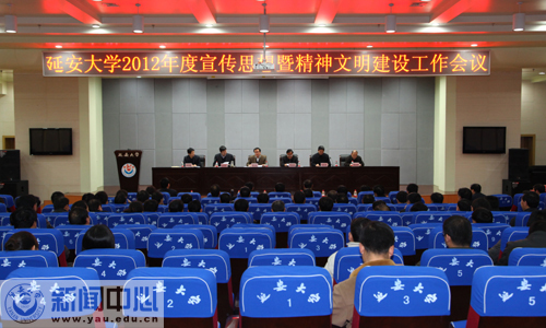 本网讯今天下午,我校在图书馆报告厅举行了2012年度宣传思想暨精神文明建设工作会议。党委书记刘建德,党委副书记、校长崔智林,党委副书记、纪委书记刘庆利,副校长张威虎,党委委员、宣传部长张高旗,延安市文明办副主任许护林等参加了会议。会议由刘庆利副书记主持。