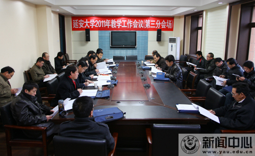 本网讯 今天上午,参加教学工作会议的代表分为5个小组,分别在图书馆第一会议室、图书馆第二会议室、逸夫楼第三会议室、化工学院会议室、信息学院会议室,就《延安大学关于“十二五”期间进一步加强和改进本科教学工作实施意见(讨论稿)》、《延安大学关于加强创新教育的实施意见》、《延安大学本科教学质量优秀奖评选奖励办法(讨论稿)》、《延安大学关于教授、副教授为本科学生上课的暂行规定(修订稿)》、《延安大学本科教学质量与教学改革工程项目管理办法(修订稿)》、《延安大学本科教学质量与教学改革工程项目经费管理办法(修订稿)》、《延安大学关于加强教师教育专业实践教学工作的实施意见(讨论稿)》、《延安大学教学会议制度(讨论稿)》、《延安大学多媒体教学管理制度(讨论稿)》和《延安大学本科生学科竞赛管理暂行办法(讨论稿)》进行了讨论。
