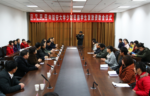 本网讯 今天下午,延安市民宗局、市工商联和延安温州商会向我校少数民族学生发放资助金仪式在我校图书馆二楼会议室举行。我校党委副书记、纪委书记刘庆利,延安市政协副主席、民革延安市委主委张玉曙,延安市民族宗教局局长黄庆琳,延安市工商联主席胡正郁,延安温州商会会长陆生,延安市民族宗教局副局长张安平,以及我校学生处副处长、学生资助中心副主任雷志强,计算机学院党委书记李喜迎,马列学院党委书记郝琦,生命科学学院党委副书记薛皓,教科院党委副书记杨文军,与经我校统战部协调,市民宗局和市工商联联系的接受资助的21名少数民族学生和各学院学生代表参加了仪式。仪式由我校统战部部长、党办主任田伏虎主持。