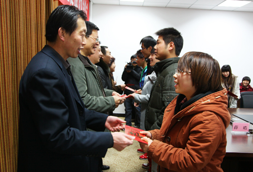 黄庆琳局长在讲话中希望受助学生倍加珍惜大学的学习时光,勇敢面对困难和挑战,自强不息,勤奋学习,自信乐观,励志进取,做民族团结的使者,以优异的成绩回报社会。随后,张玉曙、黄庆琳、胡正郁、陆生、张安平等分别为21位少数民族学生颁发了资助金,刘庆利副书记向陆生会长颁发了捐赠证书。我校政法学院2011级研究生张元作为接受资助学生代表发了言。