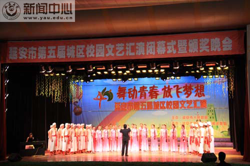 本网讯 9月26日晚7:30分,由延安市人民政府主办,市文广局、教育局和宝塔区政府承办的,以“舞动青春,放飞梦想”为主题的,延安市第五届城区校园文艺汇演颁奖晚会在延安大礼堂举行,至此四年一届的城区校园文艺汇演活动落下帷幕。延安市委常委、副市长冯继红出席晚会,并为获得一等奖的节目颁了奖。
