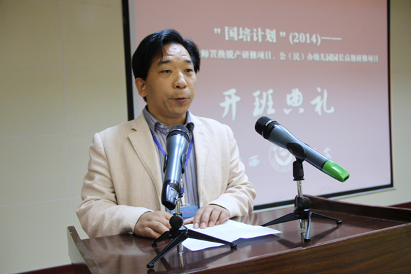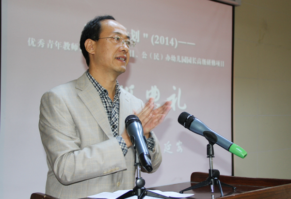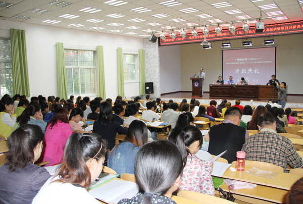 本网讯 今天上午,由陕西省教育厅主办、我校承办的“国培计划(2014)”—陕西省优秀青年教师置换脱产研修项目(初中语文培训班)和“幼师国培(2014)”陕西省公(民)办幼儿园园长高级研修项目培训班开班典礼,在克阿楼礼堂开班。延安市政协副主席、延安市实验中学副校长、特级教师申延生,延安市教育局团工委书记王权,延安市宝塔区第一幼儿园院长杜美玲,教育科学学院院长张社争,以及培训班的140余名学员参加了开班典礼。开班典礼由教育科学学院副院长魏继宗主持。