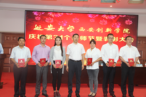 会上,副院长邵思飞宣读了《延安大学西安创新学院关于表彰2014至2015学年优秀教师、优秀辅导员和先进工作者的决定》,王喜荣董事长、邵思飞副院长、封学军副院长分别为先进工作者、优秀教师和优秀辅导员颁发了荣誉证书,学院中文系教师田德芳代表获奖教师发了言。