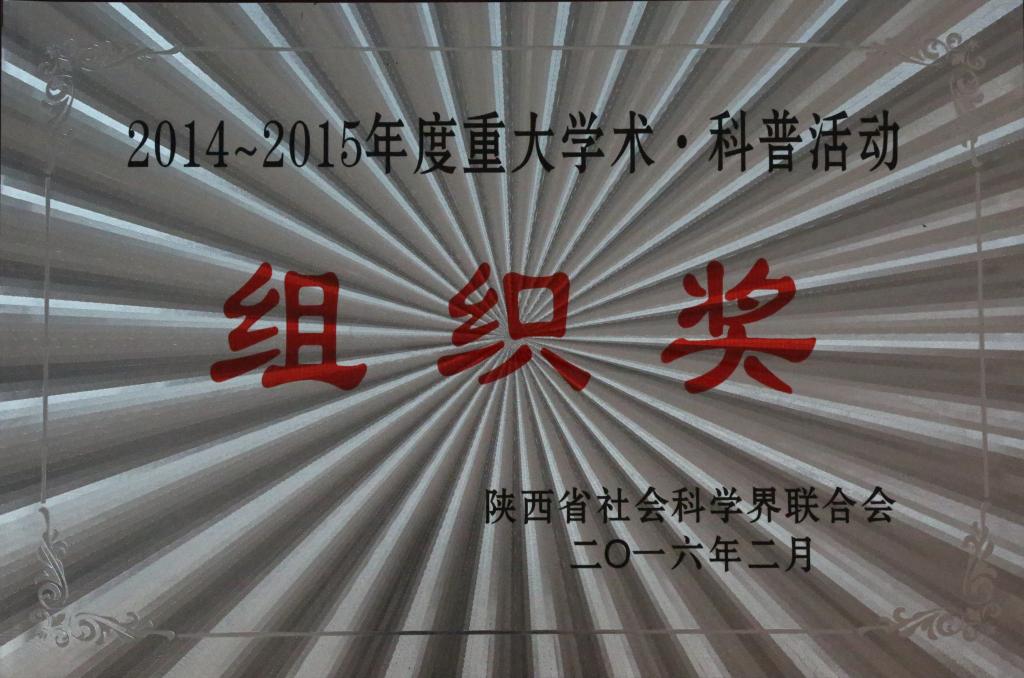 会上,表彰了2014—2015年度重大学术、科普活动优秀组织单位、先进社会组织和先进社科工作者和优秀社科普及先进个人等奖项。我校荣获重大学术、科普活动优秀组织单位。科研处副处长雷伟同时获得全省2014—2015年度先进社科工作者和陕西省社科界优秀社科普及工作者。