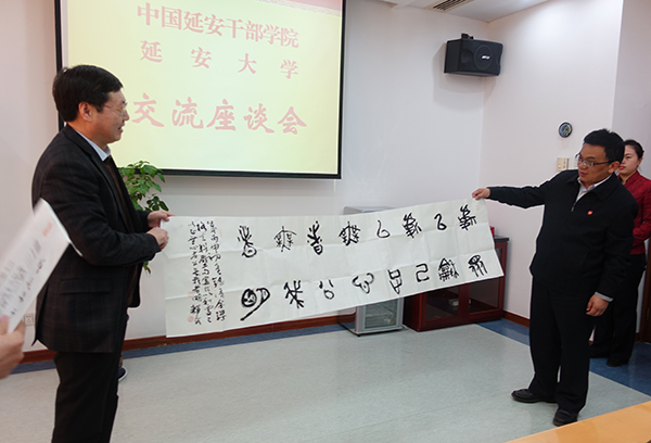 李国喜院长在讲话中指出,延安大学和中国延安干部学院都是我党在延安创办的品牌院校,都姓党,相互合作就是相互支持。两校在资源共享方面、特色共建方面、合作共赢方面,都大有文章可做,希望两校相关部门抓紧时间,抓住机遇,尽快起草好战略合作框架协议,并早日签署。同时,希望延安大学在干部学院学员医疗保健等方面能够提供更大的方便和帮助。