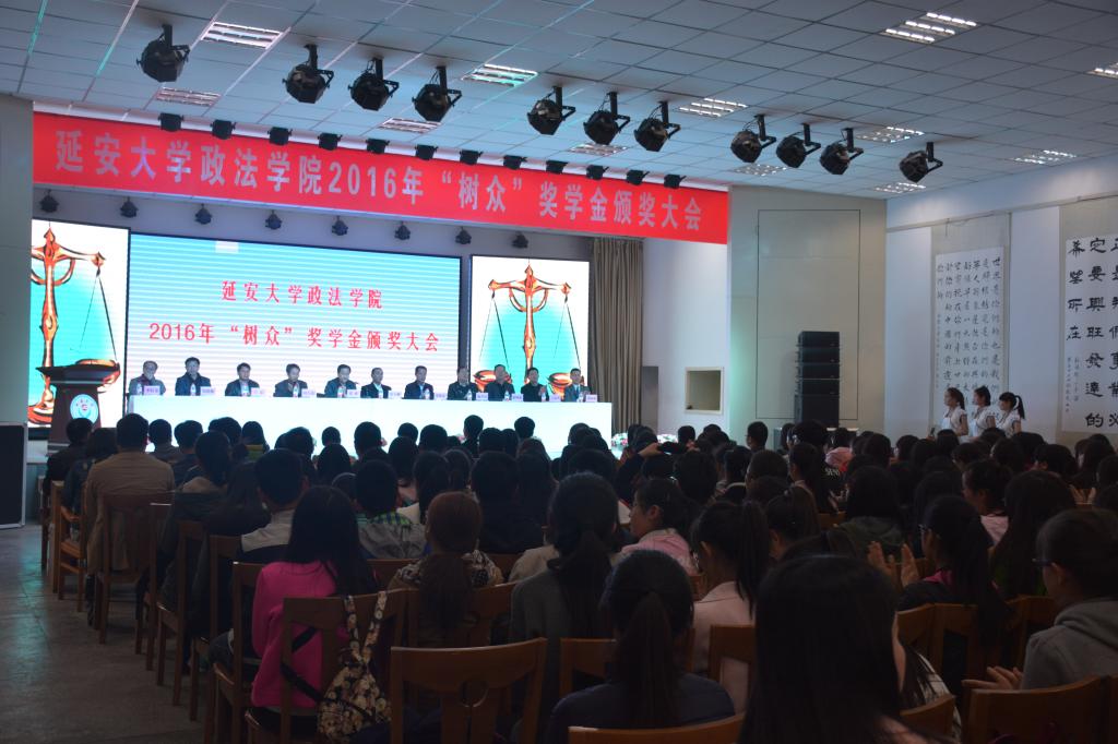 本网讯 3月17日下午,2016年“树众”奖学金颁奖大会在校大学生活动中心举行。延安市政协副主席、民革延安市委会主委张玉曙,延安市委统战部副部长、工商联党组书记张敬东,民革延安市委会副主委强学信,民革延安市委会秘书长何久高,陕西树众律师事务所主任崔树森,我校教务处副处长吕磊、学工部副部长王彦杰,我校政法学院领导,民革部分党员及获奖的18名2012级法学专业司法考试成绩优秀学生和其他200余名学生代表参加了颁奖大会。颁奖大会由政法学院党委书记葛彬主持。