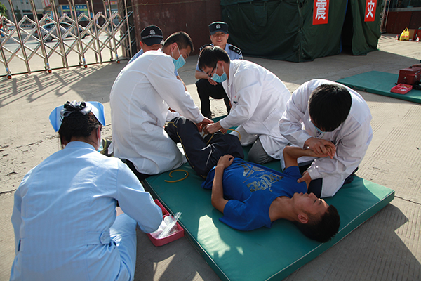 随后演练开始,演练共分三项,第一项是紧急避险疏散演练:全体师生在听到第一声防空警报响起后,就近蹲于课桌或承重墙角;采取保护头部,蜷曲身体等保护措施。当收到疏散信号后,各学院辅导员迅速组织学生疏散,按照疏散路线井然有序地离开教室到达集结地点。第二项是搜救演练:各学院在清点人数后,上报指挥员并请求救援被困学生,接着救援队进行全面地搜救工作。第三项是现场医疗救护演练;由医疗组对伤员进行模拟救护演练。本次演练设协调组、避险组、救护组、物资组,各工作组各司其职,密切配合,整个演练过程安全紧凑,井然有序,圆满完成了各项预定任务。