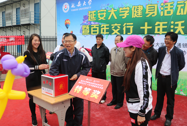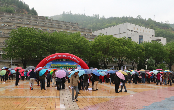 本网讯 5月14日上午,延安大学健身月活动启动仪式暨银校携手健步同行活动开幕式在窑洞广场举行,学校总会计师范育琳,延安交通银行副行长李小兵,校体委副主任、党政办主任姚正宽,体委副主任、学工部部长、学生处处长高峰,财务处副处长马树民,工会副主席高娟,延安交通银行零售业务部总经理高军、副总经理张东,全校近500名教职工冒雨参加了开幕式并全程参与了活动,开幕式由校体委副主任、工会主席白泽生主持。