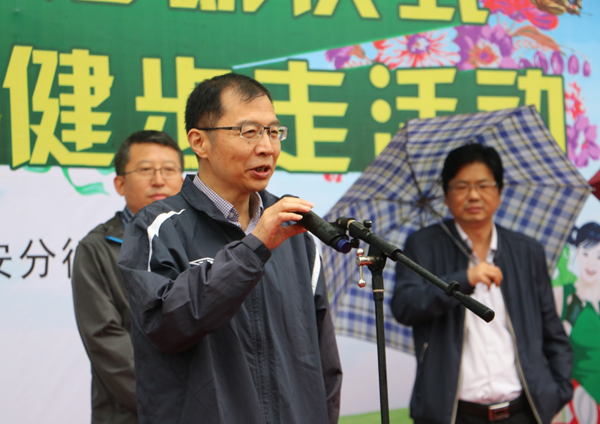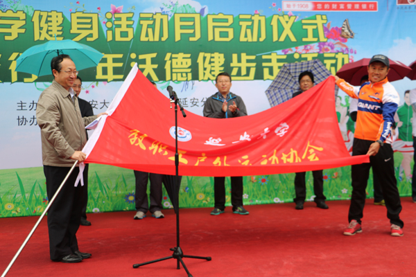 李小兵副行长讲了话,白泽生主席向教职工户外运动协会授了旗,高娟副主席宣读了《关于在全校教职工中开展以“运动、健康、快乐”为主题的健身月活动的通知》。