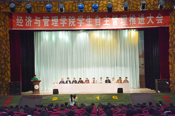 本网讯 6月2日晚,由经管学院学生自行组织、策划的学生自主管理推进会在延安大学礼堂举行。副校长胡俊生、党委委员薛美玲、学工部部长高峰、宣传部副部长郭伟、教务处副处长党子奇、校团委副书记刘江,经管学院院长姬雄华、党委书记姜庆、党委副书记薛皓、副院长李瑜、副院长卢东宁应邀参会。参加大会的还有经管学院的部分教工党员、全体辅导员、班主任老师,2015、2014级的全体同学及2013级学生代表1000余人。