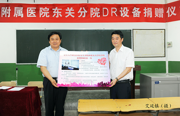 本网讯 我校附属医院经过66年的励精图治,艰苦创业,现已发展成为集医疗、教学、科研和预防、保健、急救为一体的陕北区域最大的三级医院,承担着延安和周边地区500多万人口的医疗保健工作。在心系老区人民卫生健康的同时,延安大学附属医院不忘育人初心。6月15日下午,附属医院DR设备捐赠仪式在医学院第三阶梯教室举行。我校副校长胡俊生,附院副院长、东关分院院长王建清,附院副院长李红梅,医学院院长韩继明等参加了捐赠仪式。会议由医学院副院长刘晓斌主持。
