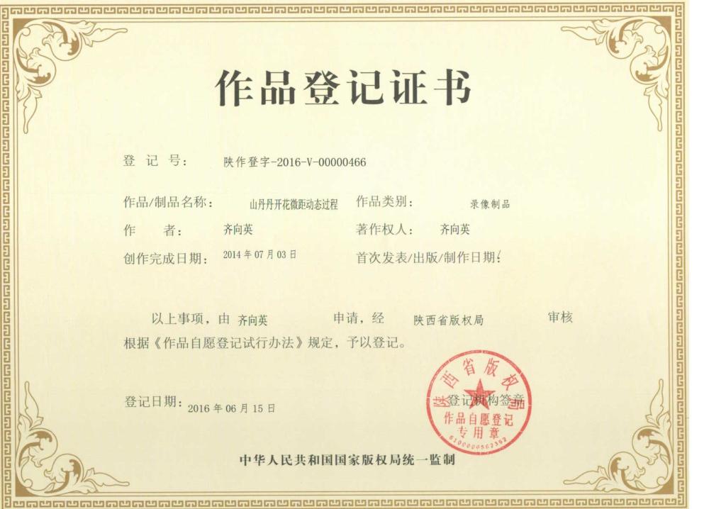 《水培山丹丹开花过程》和《山丹丹开花微距动态过程》研究工艺于2014年7月初完成,录像作品于2016年6月15日通过陕西省版权局审核并登记。近日,陕西省版权局将其定性为“录像制品”并获得“作品登记证书”(登记号分别为陕作登-2016-V-00000465和陕作登-2016-V-00000466)登记机构为“陕西省版权局”。这是我校教师首次获得陕西省录像制品版权。