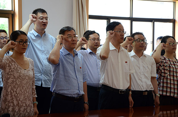 9时整,陈华副校长受邀参加创新学院深入推进“两学一做”学习教育专题会并为毕业生党员上最后一次党课。首先,陈华副校长为毕业生党员代表佩戴党徽,并与参会的所有党员一起面向党旗庄严宣誓,重温入党誓词。