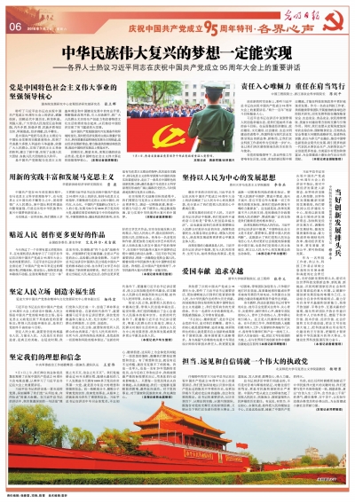 本网讯 7月2日,为了庆祝中国共产党成立95周年,我校中国共产党革命精神与文化资源研究中心杨伟宏教授应《光明日报》报社约稿,撰写《坚定人民立场,创造幸福生活》一文在第6版发表,全文分四个部分。