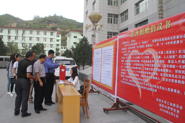 本网讯 今年9月5日是我国第一个“中华慈善日”,为弘扬中华民族扶贫济困、乐善好施的优良传统,倡导“以人为本、乐于奉献”的互助精神,根据延安市民政局、延安市慈善协会《关于开展学习贯彻《慈善法》,以实际行动“迎9·5慈善一日捐”爱心大行动的安排意见》,校工会在全校范围内发布了“迎9·5慈善一日捐”的倡议书,得到了全校师生员工的积极响应。